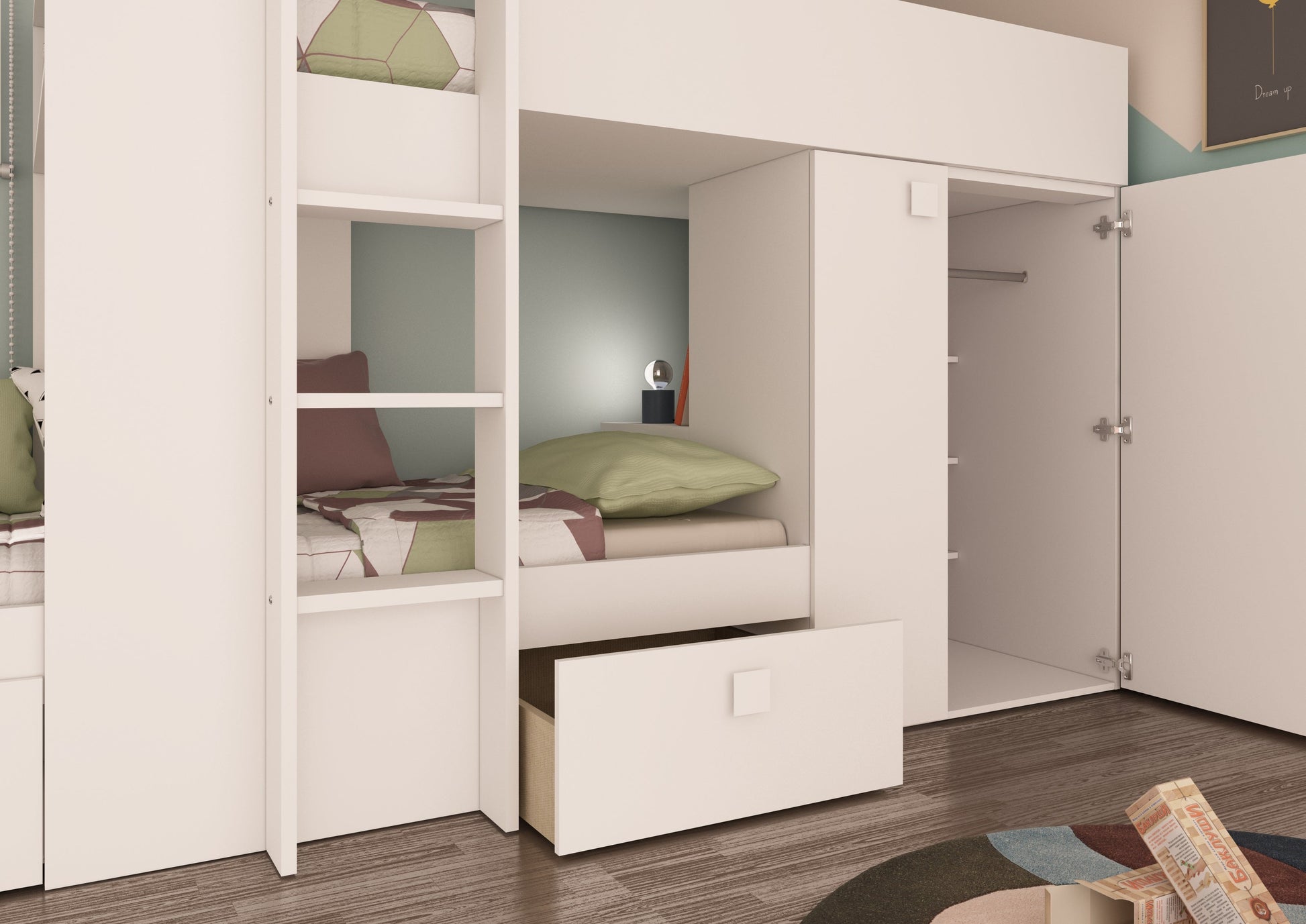 This amazing bunk bed has a hard wearing easy clean Cascina wood effect finish that is complimented by one white wardrobe drawer and Shade coloured 2nd wardrobe door and drawer fronts. Bed Bases are included.