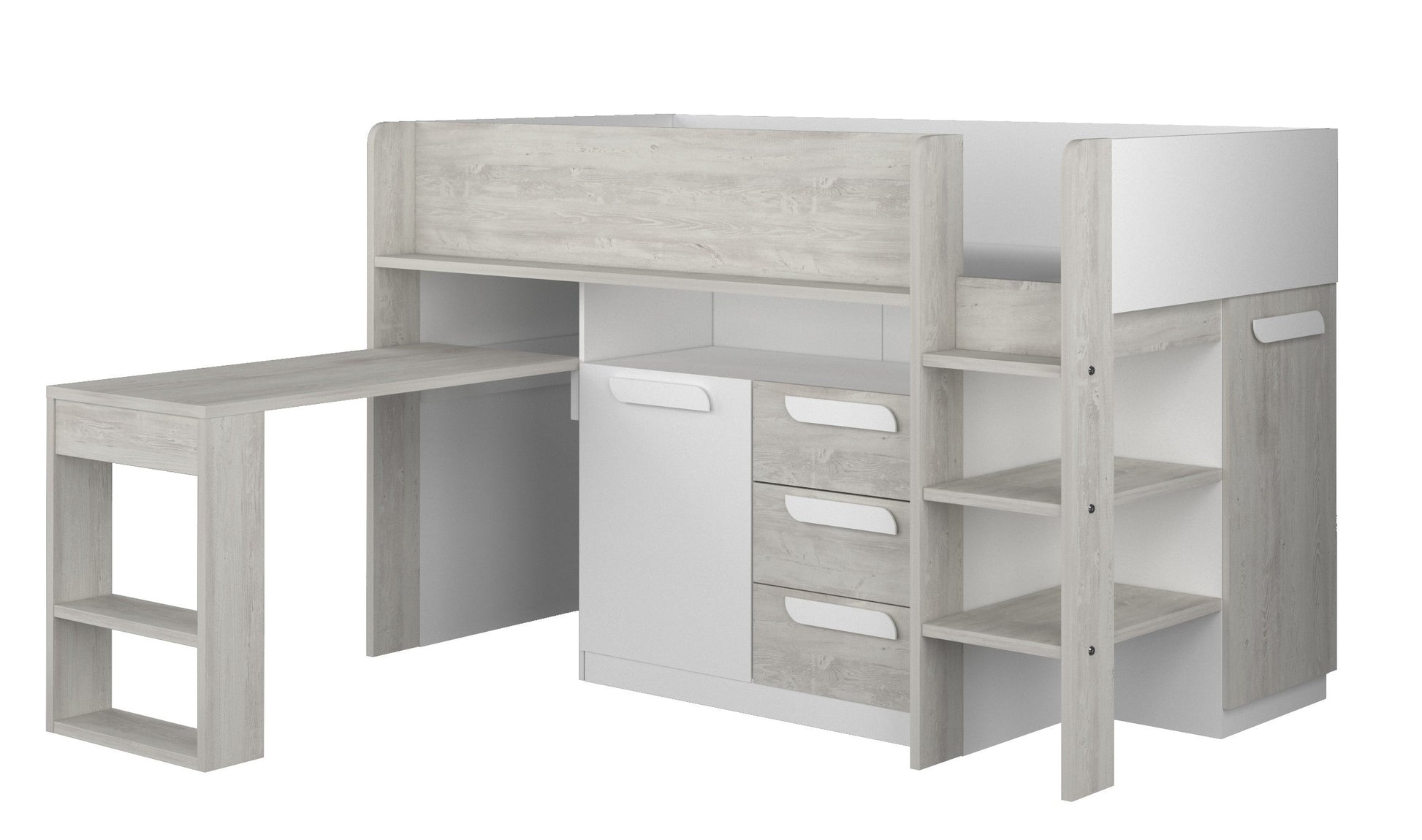 Trasman Kids Girona Midsleeper Bed The Trasman Kids white Girona Midsleeper Bed with a modern wood effect finish features a pull-out desk, drawers, cupboards and shelving for storage. The Girona Midsleeper maximises floor space by neatly tucking an array of storage options to keep things neat and tidy. The fixed ladder has 3 steps, the bottom 2 are deep steps extending under the bed frame giving extra storage shelves accessible from the front or end of the bed frame. Across the front, a long bedside shelf offers a place to store a whole variety of items with easy access from in or out of the bed. To the left side of the ladder are 3 storage drawers, a single-door cupboard and a long shelf space.