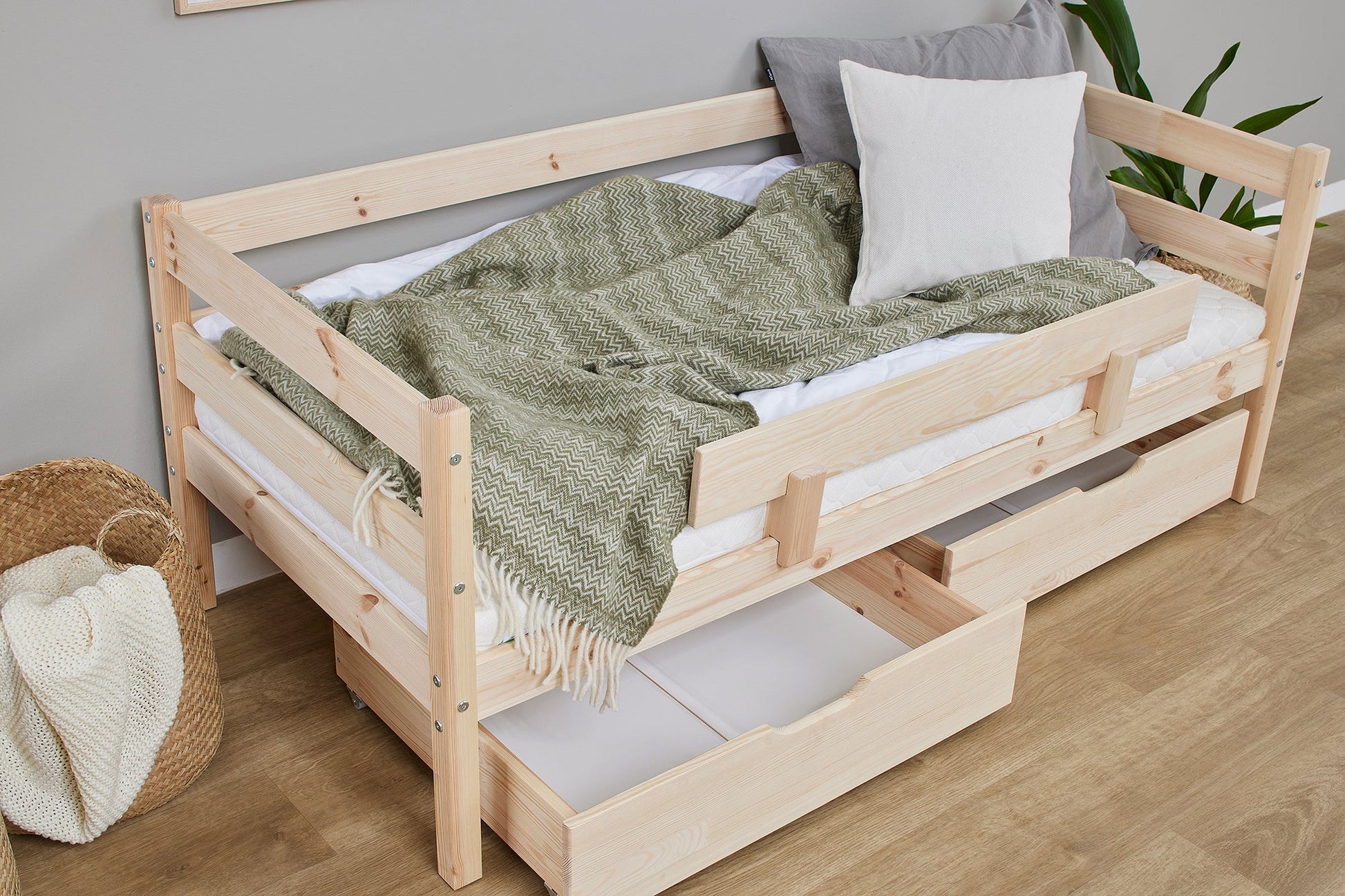 This gorgeous solid pine Hoppekids Shorty Bed is the perfect transitional toddler bed from cot to full size single bed. This fantastic Scandinavian design is just 160cm long and with an extra safety rail the bed is a beautiful safe haven for your child to sleep. The solid pine sturdy frame has a natural finish that is coated with a plant based nontoxic lacquer making it both stylish and durable, and it will compliment any colour scheme in both a modern or traditional home. Includes 2 handy storage drawers.
