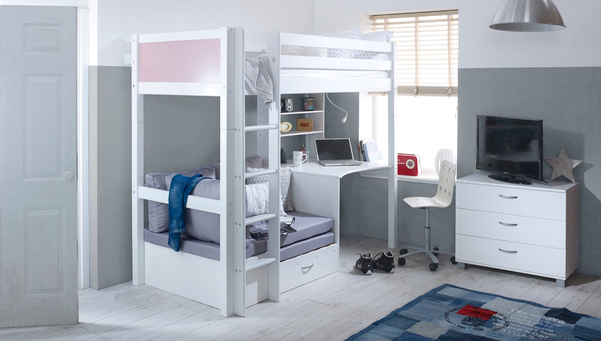 The Thuka Nordic high sleeper bed 3 in a white finish with flat panelled gable ends features a reversible position 3 step ladder, pull out sofa bed with black cushions, a fixed desk with a curved front and desktop shelving.