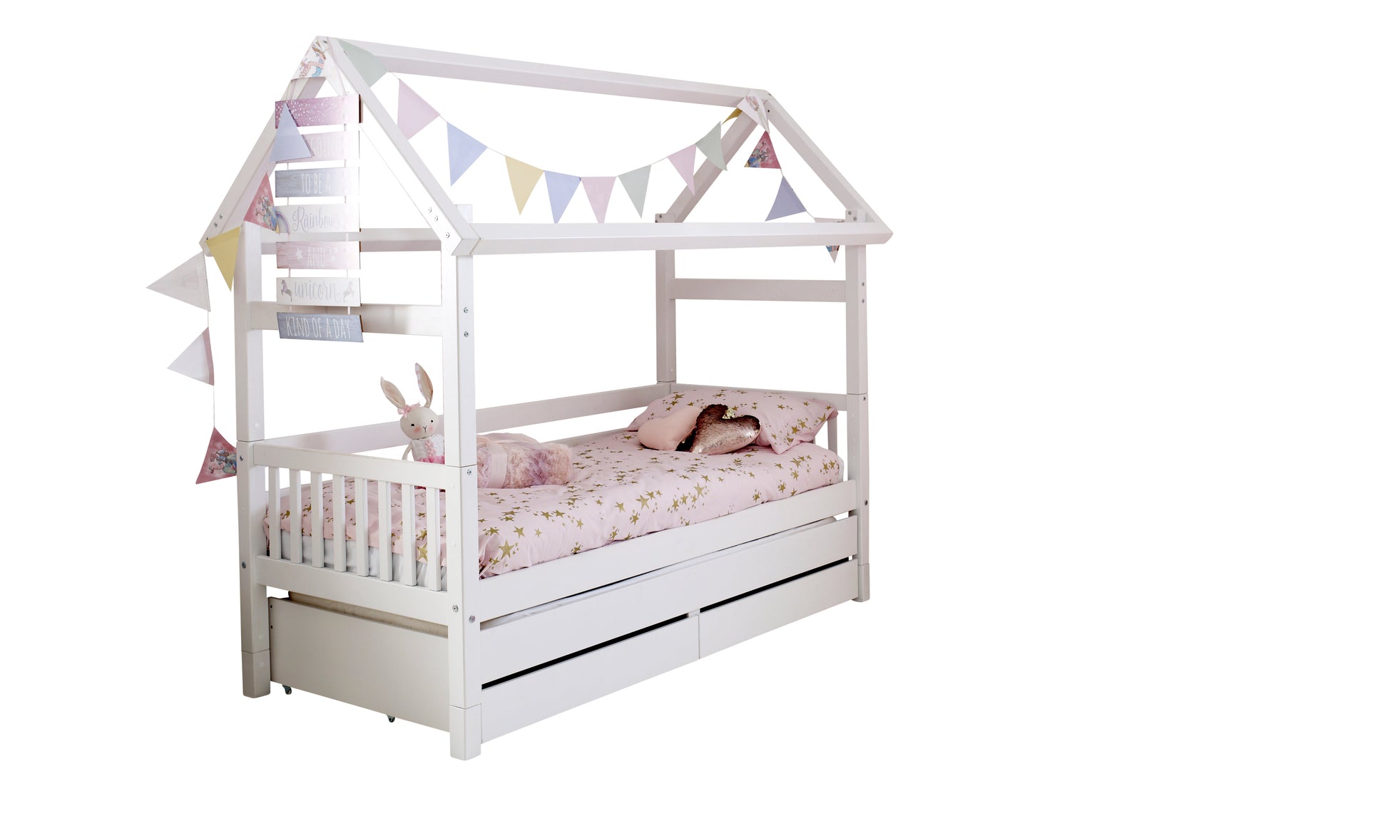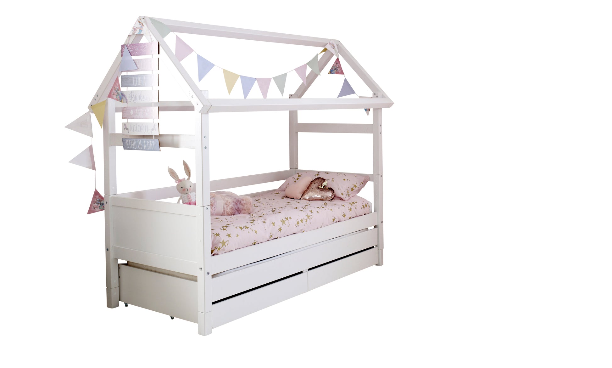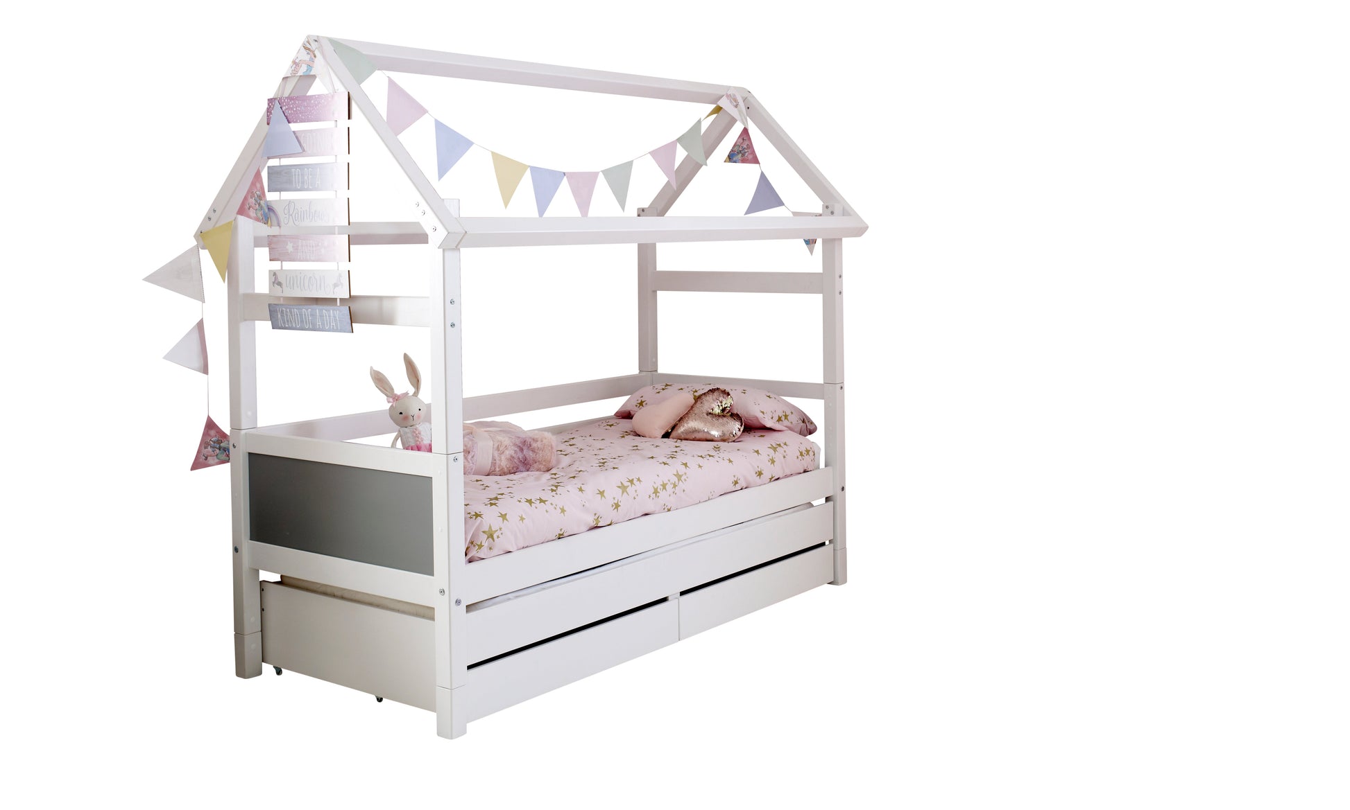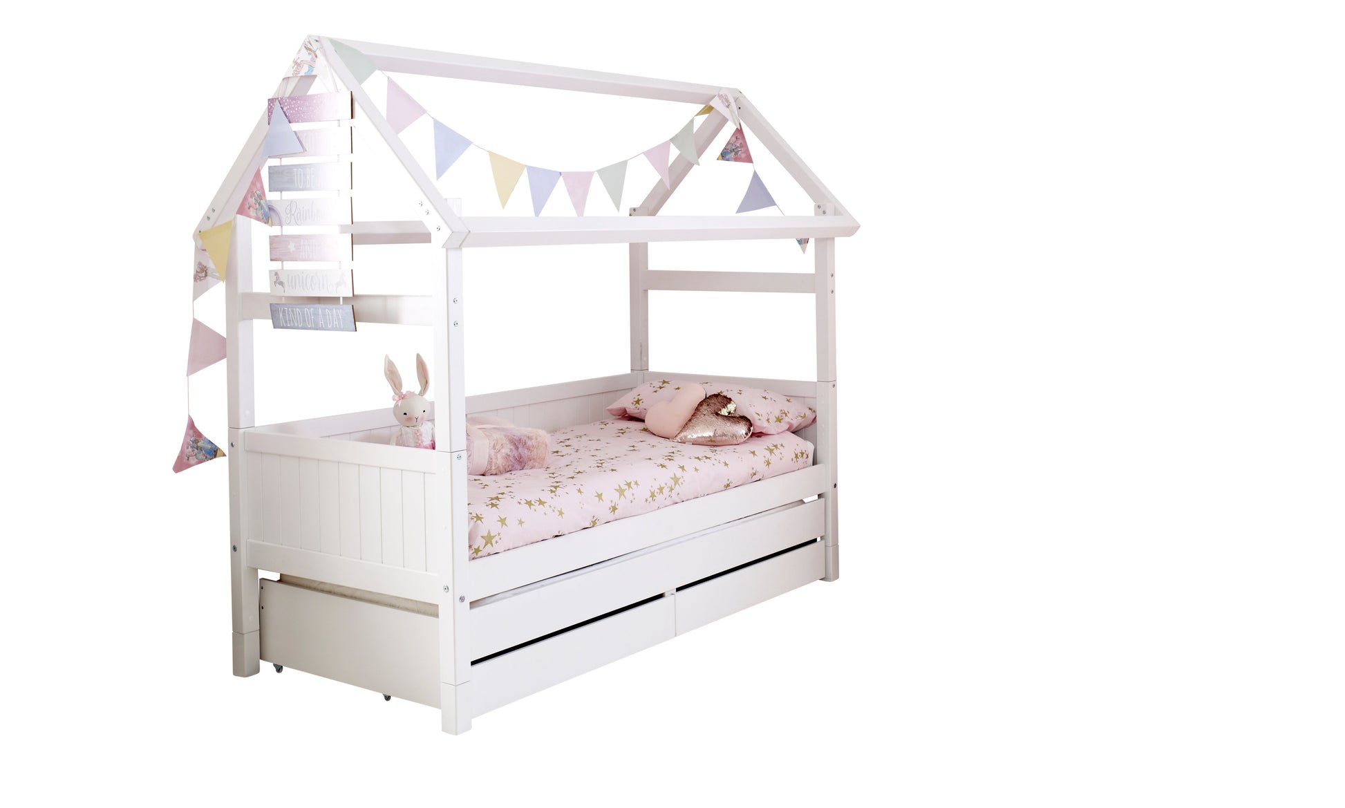 The Thuka Nordic Playhouse Day Bed 1 in White is a sturdy and stylish day bed single bed, made from solid Scandinavian pine and finished in a smooth white lacquer. The Nordic's contemporary design is accompanied by great functionality, and the creative playhouse design will be a lovely playful addition to your childs bedroom. The Nordic Playhouse Day Bed comes in plain white, and with a choice of five headboard finishes to complement any bedroom offering a contemporary or classic look. Choose from solid white, grey or rose, or a slatted white or tongue/grooved white finish.