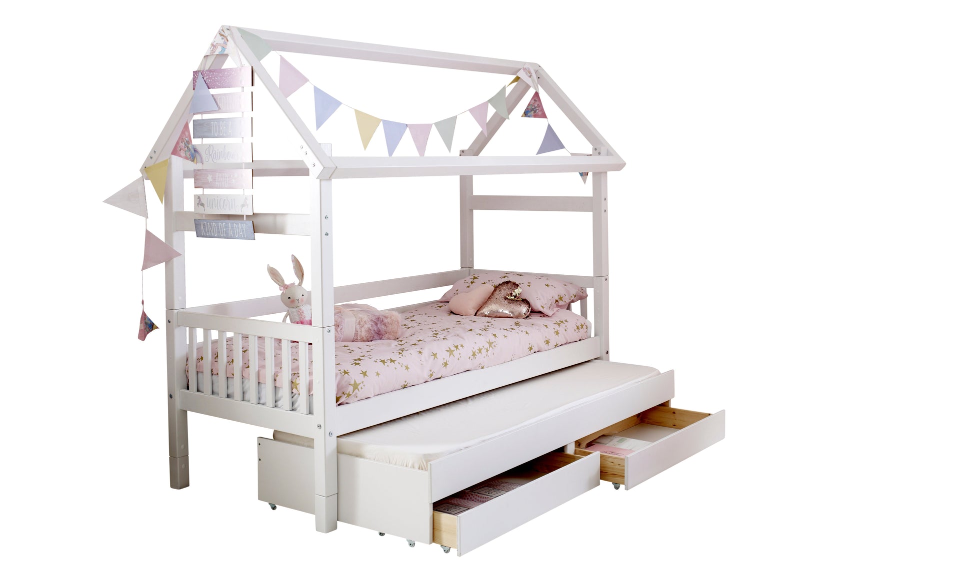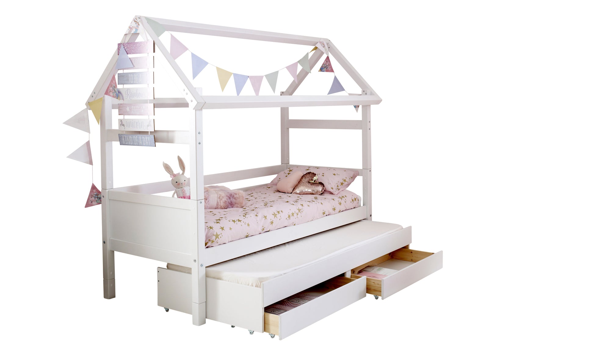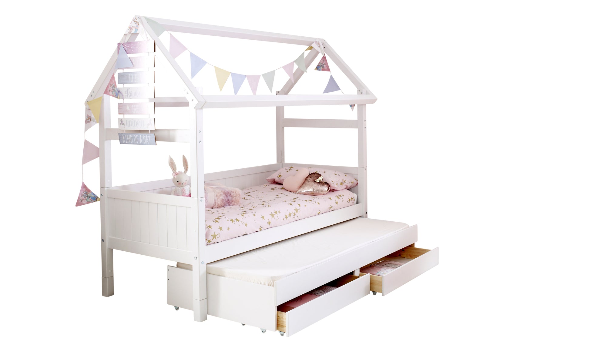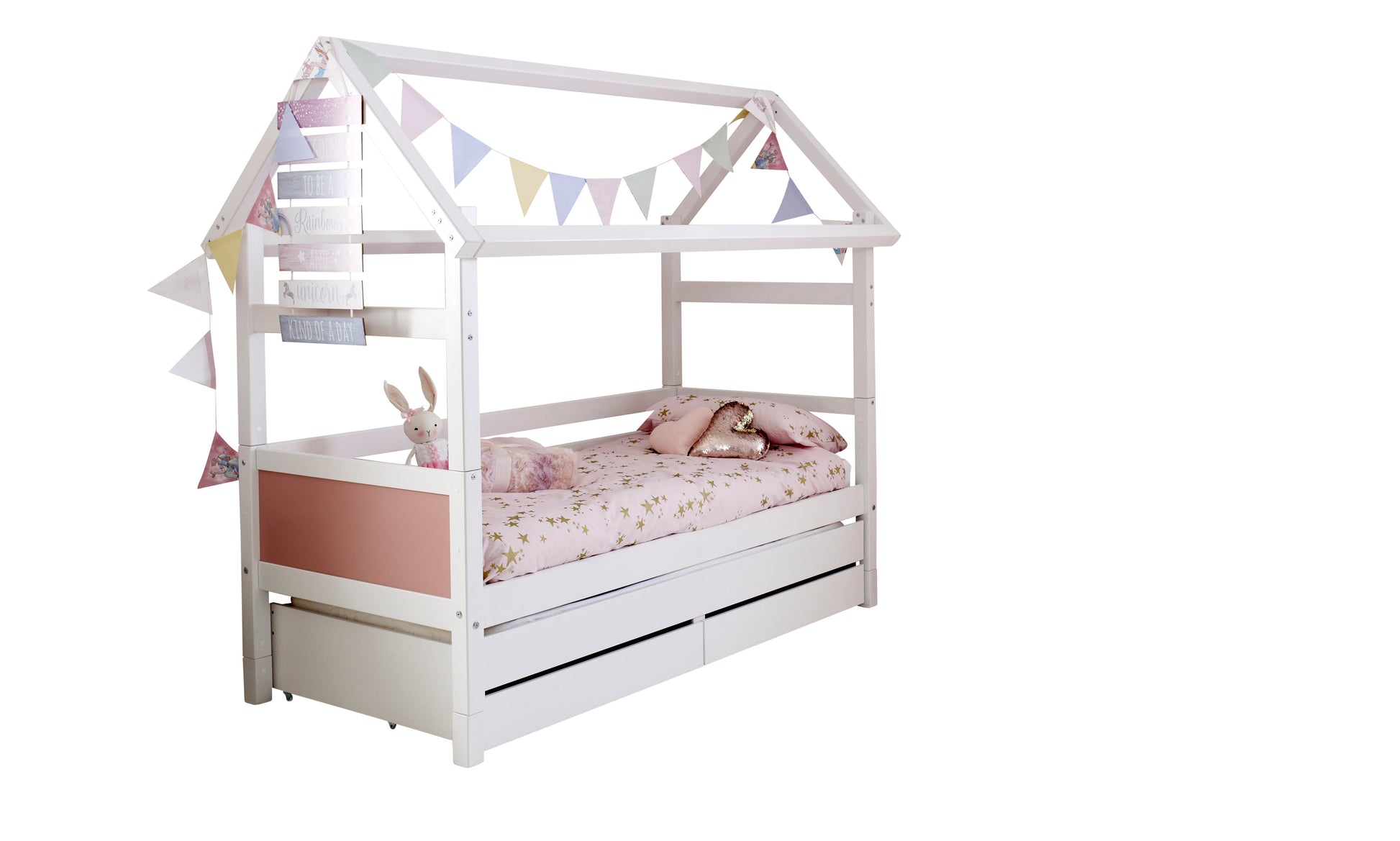The Thuka Nordic Playhouse Day Bed 1 in White is a sturdy and stylish day bed single bed, made from solid Scandinavian pine and finished in a smooth white lacquer. The Nordic's contemporary design is accompanied by great functionality, and the creative playhouse design will be a lovely playful addition to your childs bedroom. The Nordic Playhouse Day Bed comes in plain white, and with a choice of five headboard finishes to complement any bedroom offering a contemporary or classic look. Choose from solid white, grey or rose, or a slatted white or tongue/grooved white finish.