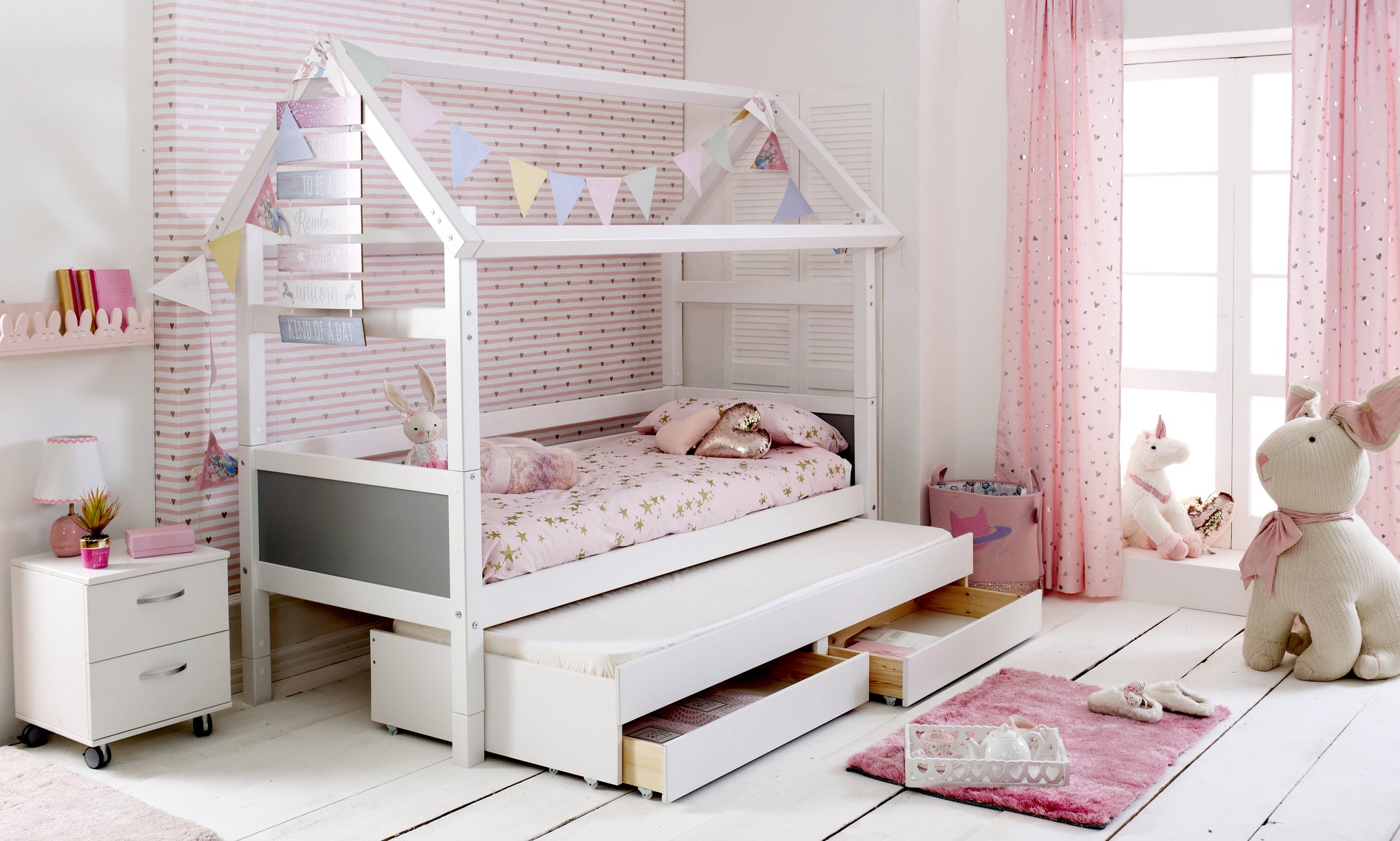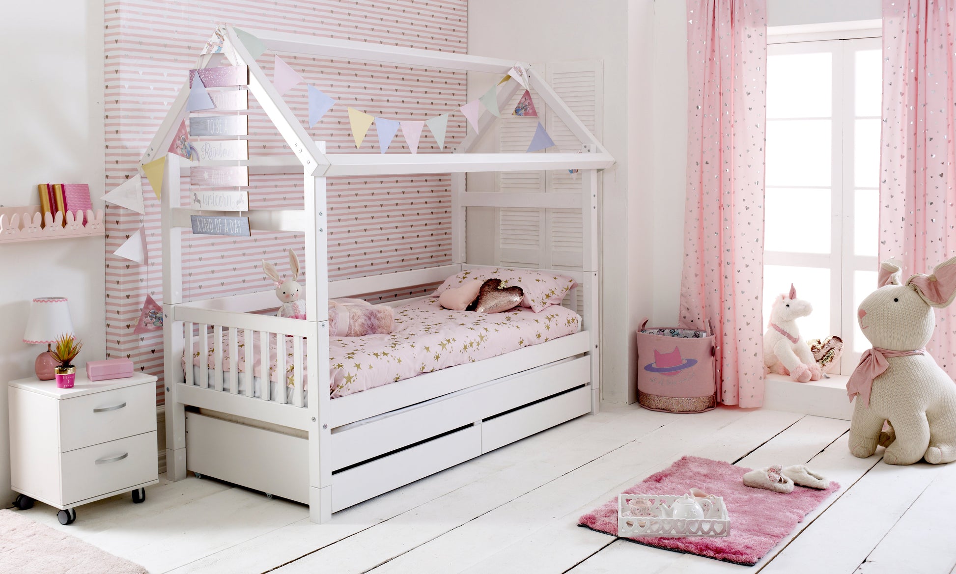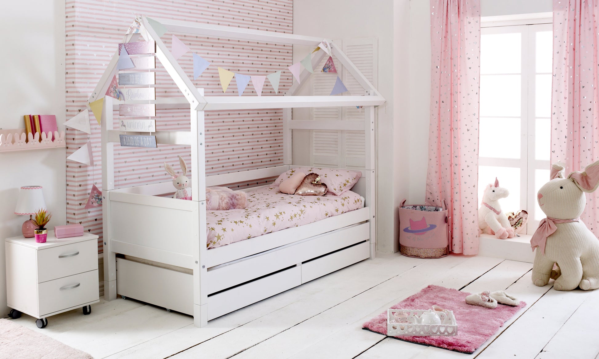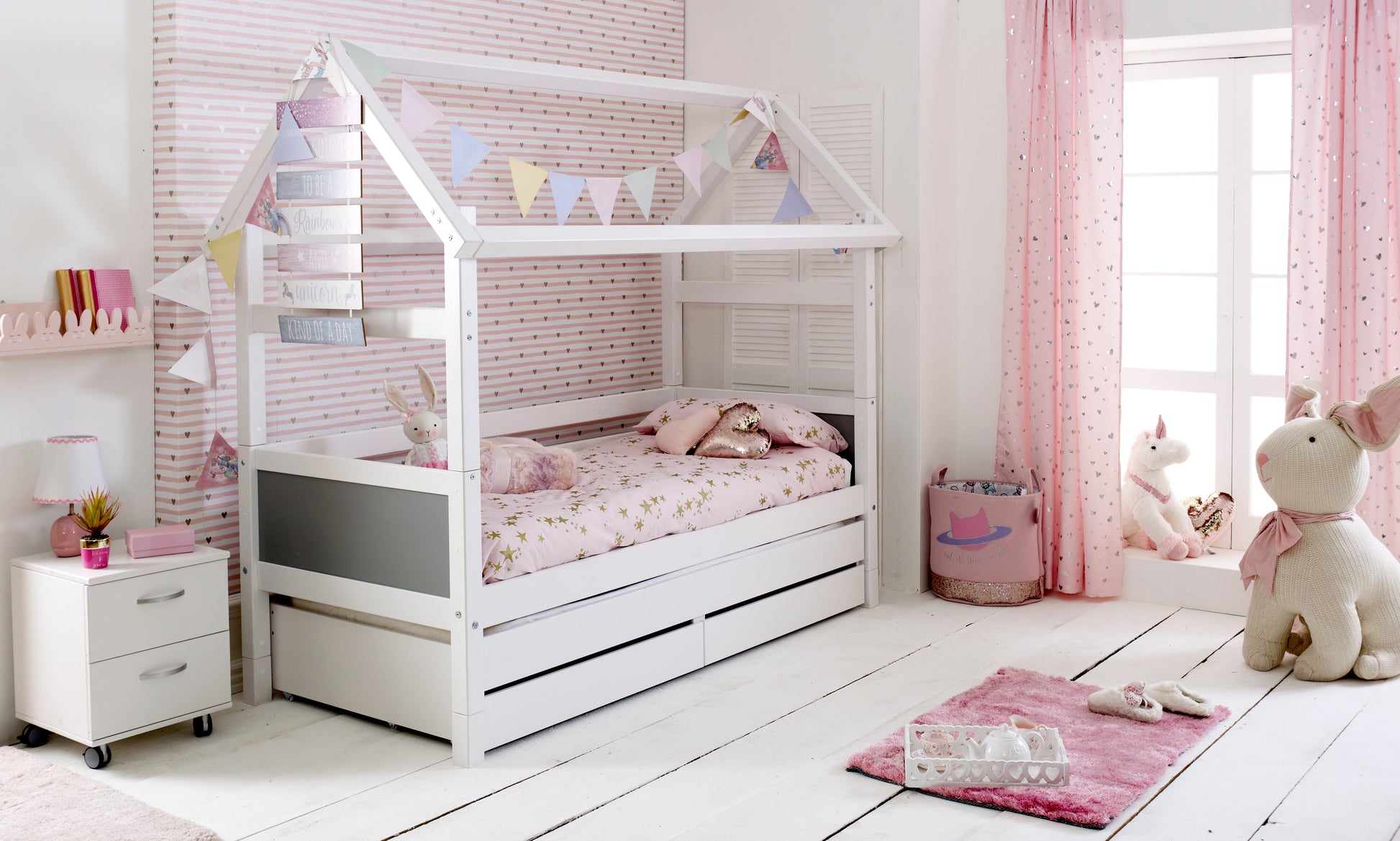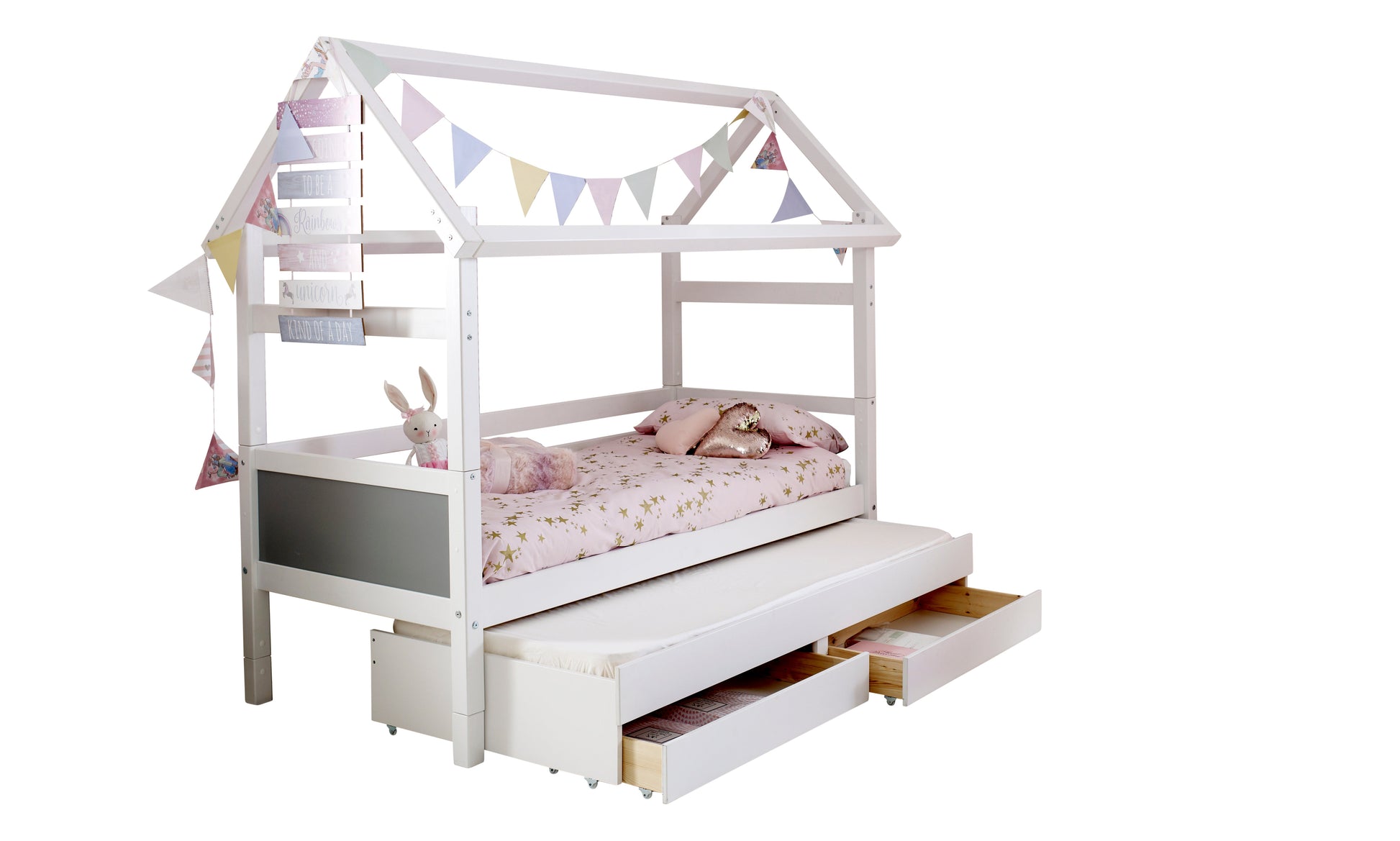 The Thuka Nordic Playhouse Day Bed 1 in White is a sturdy and stylish day bed single bed, made from solid Scandinavian pine and finished in a smooth white lacquer. The Nordic's contemporary design is accompanied by great functionality, and the creative playhouse design will be a lovely playful addition to your childs bedroom. The Nordic Playhouse Day Bed comes in plain white, and with a choice of five headboard finishes to complement any bedroom offering a contemporary or classic look. Choose from solid white, grey or rose, or a slatted white or tongue/grooved white finish.